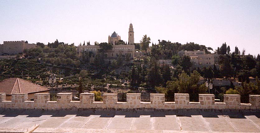 The view from the observation point was breathtaking. The Temple Mount and the Dome of the Rock are featured near the center of the picture, and lots of other historical and religious sites are visible. One amazing thing is that, standing there, it's possible to see all the way to the Dead Sea. (This would be off the right side of the picture; it's not visible on film anyway.) We saw what looked like clouds above it. When it was pointed out to us that they weren't clouds but, in fact, the hills of Jordan in the distant haze, it came to me just how small this country is. Although it is a couple of hundred miles from north to south, it is very narrow east to west, especially in the area around Tel Aviv and Jerusalem. It's about an hour's drive from the beach at Tel Aviv to Jerusalem, and only a little farther from there to the Jordanian border. The entire country is slightly smaller than the state of New Jersey.