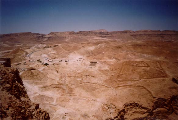 On our way out, we got another nice view of the Dead Sea and the desolate surroundings. A few minutes later we came to Masada. (Another picture.) Masada is a mountain next to the shore of the Dead Sea. It has a flat top and nearly vertical sides, and there are deep valleys between it and the neighboring mountains. Because of this, it's a natural site for a fortress. King Herod saw this and built a fortress and palace there between 37 and 31BC.